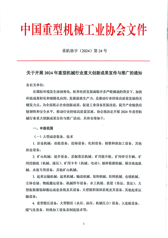 关于开展2024年重型机械行业重大创新成果宣传与推广的通知