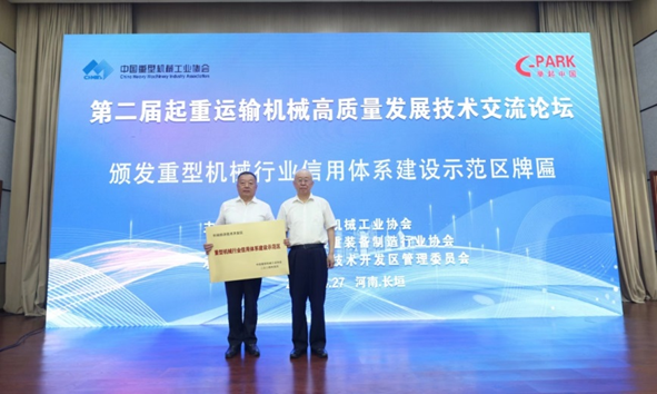 4月27日,在第二届起重运输机械高质量发展技术交流论坛期间举办了长垣经济技术开发区“重型机械行业信用体系建设示范区”授牌仪式。中国重型机械工业协会常务副理事长景晓波为长垣经济技术开发区管理委员会主任李联合颁发牌匾。