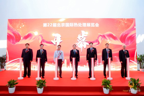 5月8日,中国重型机械工业协会常务副理事长景晓波(图中右一)受邀出席第22届北京国际热处理展览会开幕式,与主办单位中国热处理行业协会会长李新亚等领导、嘉宾共同宣布开幕。在巡馆期间与展商亲切交流。