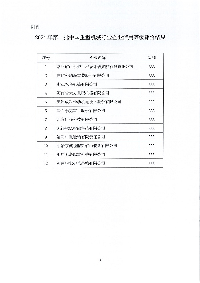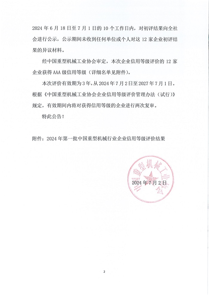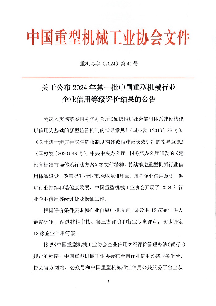 关于公布2024年第一批中国重型机械行业企业信用等级评价结果的公告
