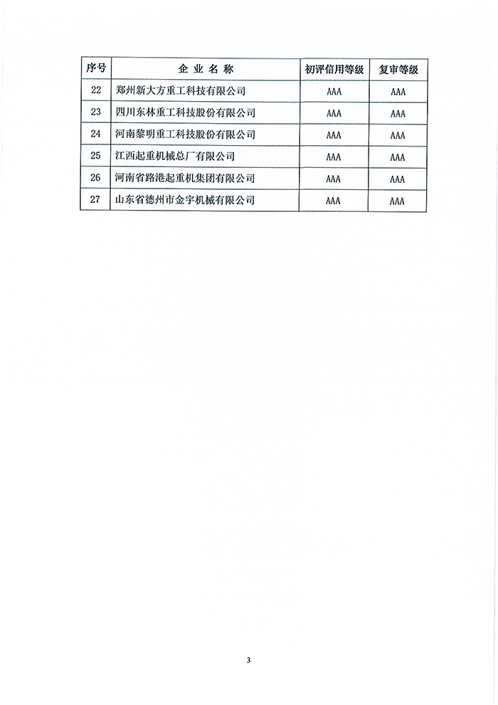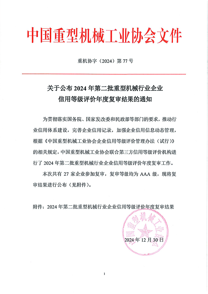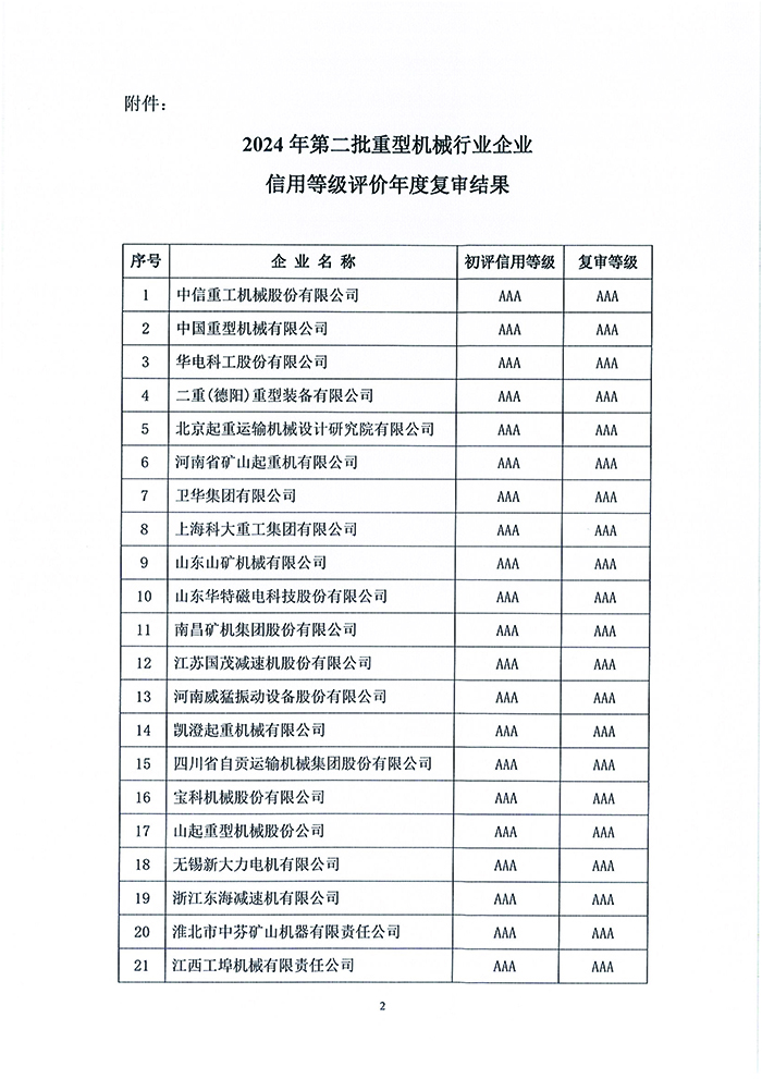 关于公布2024年第二批重型机械行业企业信用等级评价年度复审结果的通知