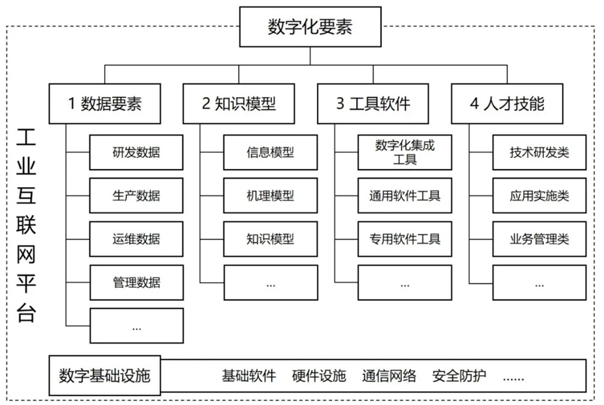 场景的数字化转型需要相配套的数字化要素支撑。围绕场景转型所需的“人、机、料、法、环”等资源,将场景数字化要素划分为数据要素、知识模型、工具软件、人才技能等4类要素以及数字基础设施保障(如图2所示)。