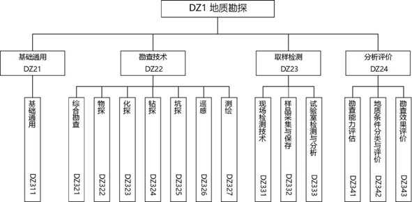 地质勘探标准子体系分为基础通用、勘查技术、取样检测、分析评价 4个类别,如图 3所示。其中,勘查技术类别分为综合勘查、物探、化探、钻探、坑探、遥感、测绘等;取样检测类别分为现场检测技术、样品采集与保存、试验室检测与分析等;分析评价类别分为勘查能力评估、地质条件分类与评价、勘查效果评价等。