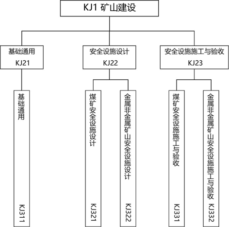 矿山建设标准子体系分为基础通用、安全设施设计、安全设施施工与验收 3个类别,如图 4所示。其中,安全设施设计类别分为煤矿安全设施设计、金属非金属矿山安全设施设计等;安全设施施工与验收类别分为煤矿安全设施施工与验收、金属非金属矿山安全设施施工与验收等。