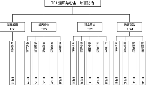 通风与粉尘、热害防治标准子体系分为基础通用、通风安全、粉尘防治、热害防治 4个类别,如图 5所示。其中,通风安全类别分为通风计算、监测评估、通风设施、通风系统、通风管理等;粉尘防治类别分为监测评估、防尘设施、防尘技术、防尘系统、防尘管理等;热害防治类别分为监测评估、降温设施、降温系统、降温管理等。