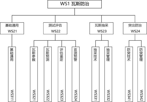 瓦斯防治标准子体系分为基础通用、测试评估、瓦斯抽采、突出防治 4个类别,如图 6所示。其中,测试评估类别分为瓦斯参数、瓦斯预测、评估鉴定、监测预警等;瓦斯抽采类别分为抽采技术、抽采管理等;突出防治类别分为防突技术、防突管理等。