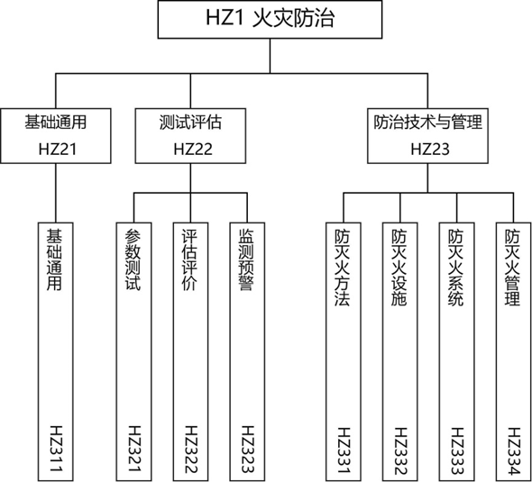 火灾防治标准子体系分为基础通用、测试评估、防治技术与管理 3个类别,如图 7所示。其中,测试评估类别分为参数测试、评估评价、监测预警等;防治技术与管理类别分为防灭火方法、防灭火设施、防灭火系统、防灭火管理等。