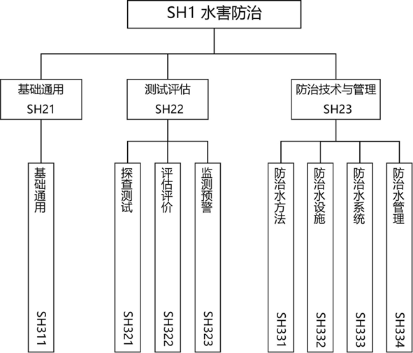 水害防治标准子体系分为基础通用、测试评估、防治技术与管理 3个类别,如图 8所示。其中,测试评估类别分为探查测试、评估评价、监测预警等;防治技术与管理类别分为防治水方法、防治水设施、防治水系统、防治水管理等。