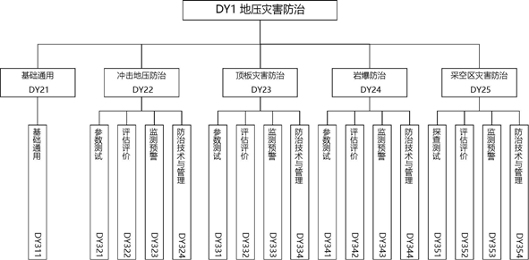 地压灾害防治标准子体系分为基础通用、冲击地压防治、顶板灾害防治、岩爆防治、采空区灾害防治 5个类别,如图 9所示。其中,冲击地压防治类别分为参数测试、评估评价、监测预警、防治技术与管理等;顶板灾害防治类别分为参数测试、评估评价、监测预警、防治技术与管理等;岩爆防治类别分为参数测试、评估评价、监测预警、防治技术与管理等;采空区灾害防治类别分为探查测试、评估评价、监测预警、防治技术与管理等。