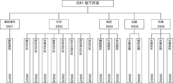 地下开采标准子体系分为基础通用、开采、掘进、运输、充填 5个类别,如图 10所示。其中,开采类别分为壁式开采、房柱式开采、充填法开采、崩落法开采、空场法开采、钻井水溶开采、原地浸出开采、其他开采等;掘进类别分为爆破掘进、机械掘进、其他掘进等;运输类别分为主要运输、辅助运输等;充填类别分为充填技术、充填设施、充填系统等。