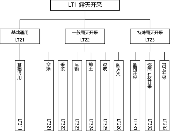 (十)露天开采。露天开采标准子体系分为基础通用、一般露天开采、特殊露天开采 3个类别,如图 11所示。一般露天开采类别分为穿爆、采装、运输、排土、边坡、防灭火等;特殊露天开采类别分为盐湖开采、饰面石材开采、其它开采等。