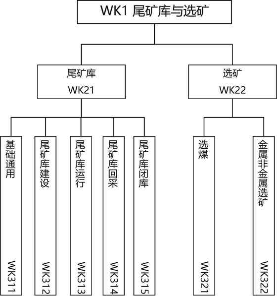 (十一)尾矿库与选矿。尾矿库与选矿标准子体系分为尾矿库、选矿 2个类别,如图 12所示。其中,尾矿库类别分为基础通用、尾矿库建设、尾矿库运行、尾矿库回采、尾矿库闭库等;选矿类别分为选煤、金属非金属选矿等。