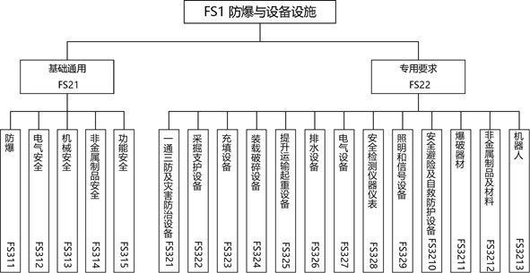 (十二)防爆与设备设施。防爆与设备设施标准子体系分为基础通用和专用要求 2个类别,如图 13所示。其中,基础通用类别分为防爆、电气安全、机械安全、非金属制品安全、功能安全等;专用要求类别根据不同矿用产品特点以及生产作业工艺流程,分为一通三防及灾害防治设备、采掘支护设备、充填设备、装载破碎设备、提升运输起重设备、排水设备、电气设备、安全检测仪器仪表、照明和信号设备、安全避险及自救防护设备、爆破器材、非金属制品及材料、机器人等。