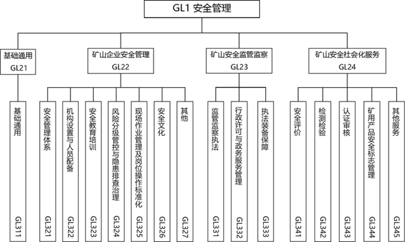 安全管理标准子体系分为基础通用、矿山企业安全管理、矿山安全监管监察、矿山安全社会化服务 4个类别,如图 16所示。其中,矿山企业安全管理类别分为安全管理体系、机构设置与人员配备、安全教育培训、风险分级管控与隐患排查治理、现场作业管理及岗位操作标准化、安全文化、其他等;矿山安全监管监察类别分为监管监察执法、行政许可与政务服务管理、执法装备保障等;矿山安全社会化服务类别分为安全评价、检测检验、认证审核、矿用产品安全标志管理、其他服务等。