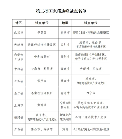 为落实国务院《2030年前碳达峰行动方案》(国发〔2021〕23号)有关部署,按照《国家碳达峰试点建设方案》(发改环资〔2023〕1409号)工作安排,经试点单位自愿申报、省级发展改革委推荐、省级人民政府审核、国家发展改革委复核,确定第二批27个国家碳达峰试点,现予公布,并就有关事项通知如下: