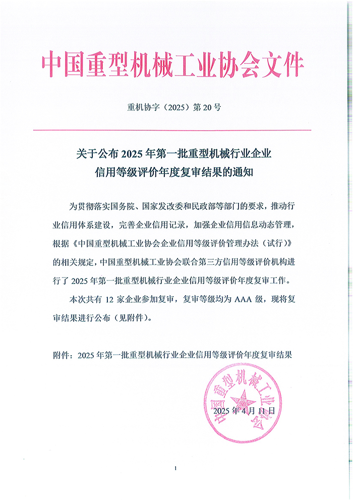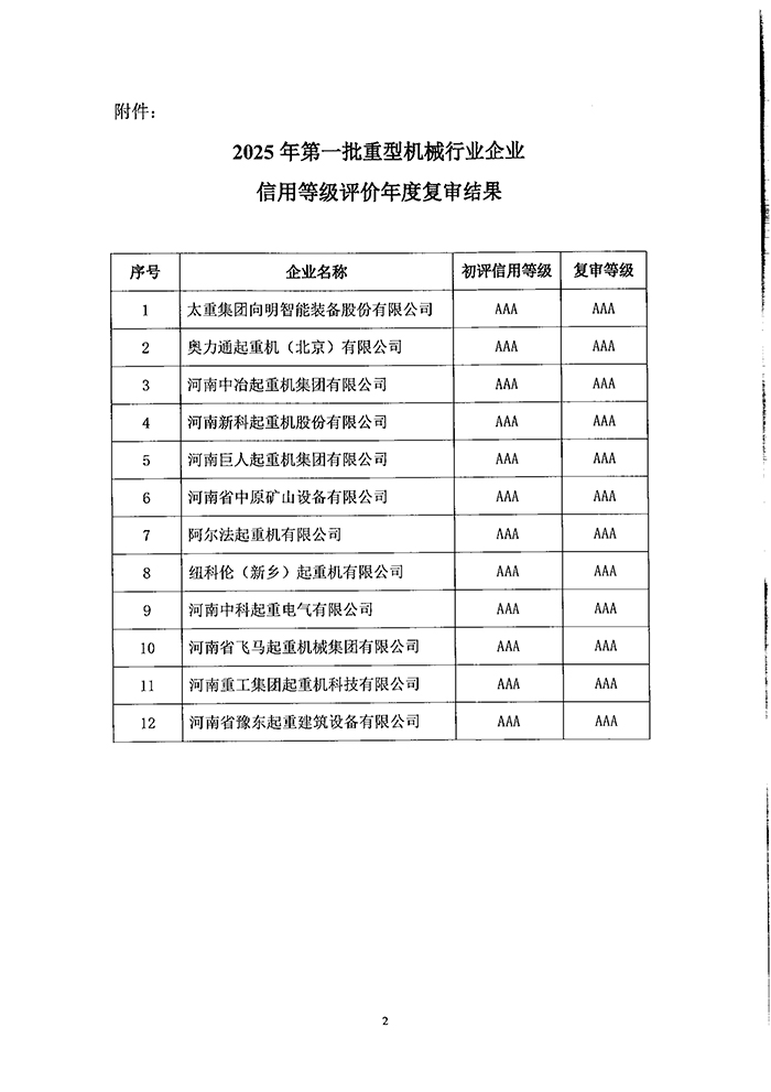 关于公布2025年第一批重型机械行业企业信用等级评价年度复审结果的通知
