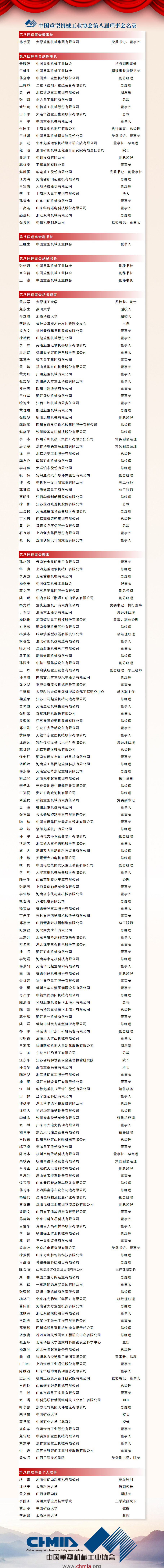 | 中国重型机械工业协会于2025年2月24日召开第九届第一次会员代表大会表决通过本届理事名单;于2025年2月24日召开第九届第一次理事会表决通过本届常务理事名单。 | |||