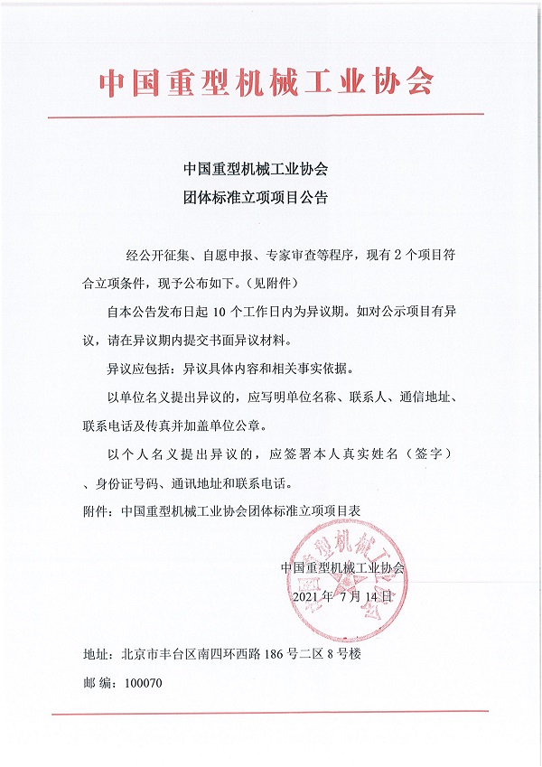 [ 2024-12-20 ]中国重型机械工业协会团体标准立项项目公告