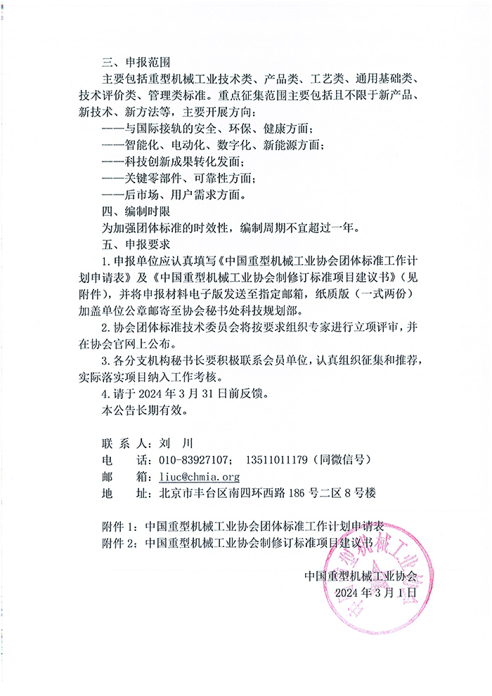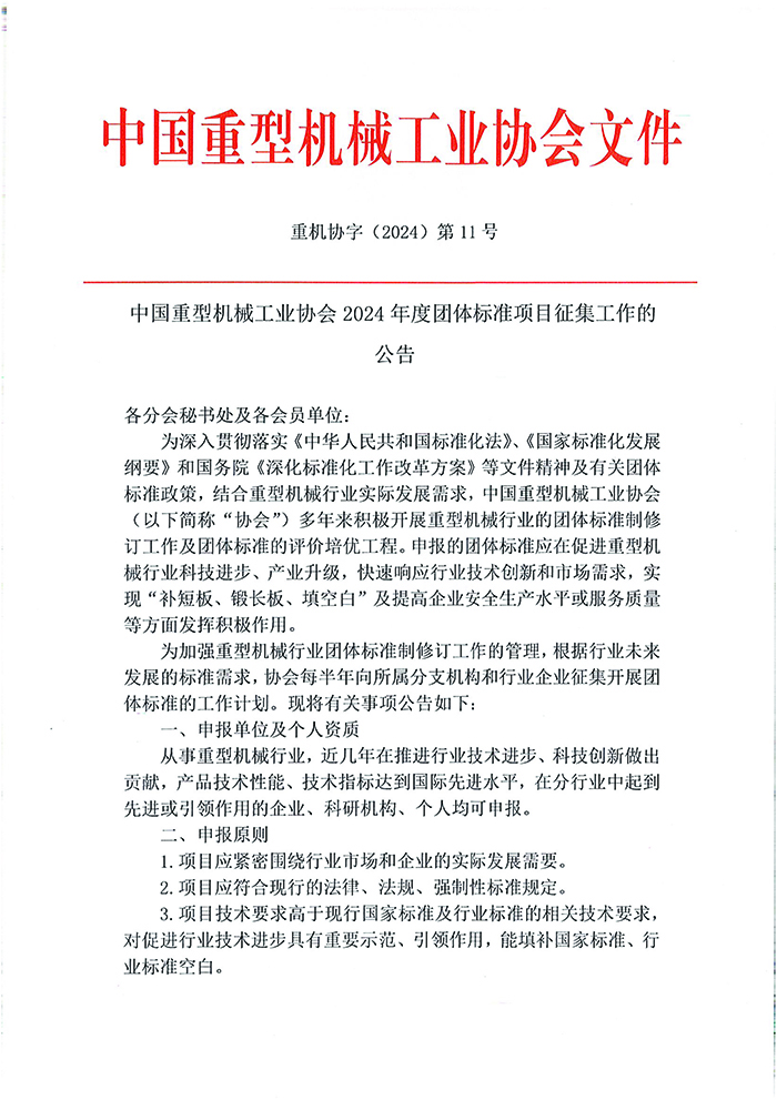 中国重型机械工业协会2024年度团体标准项目征集工作的公告