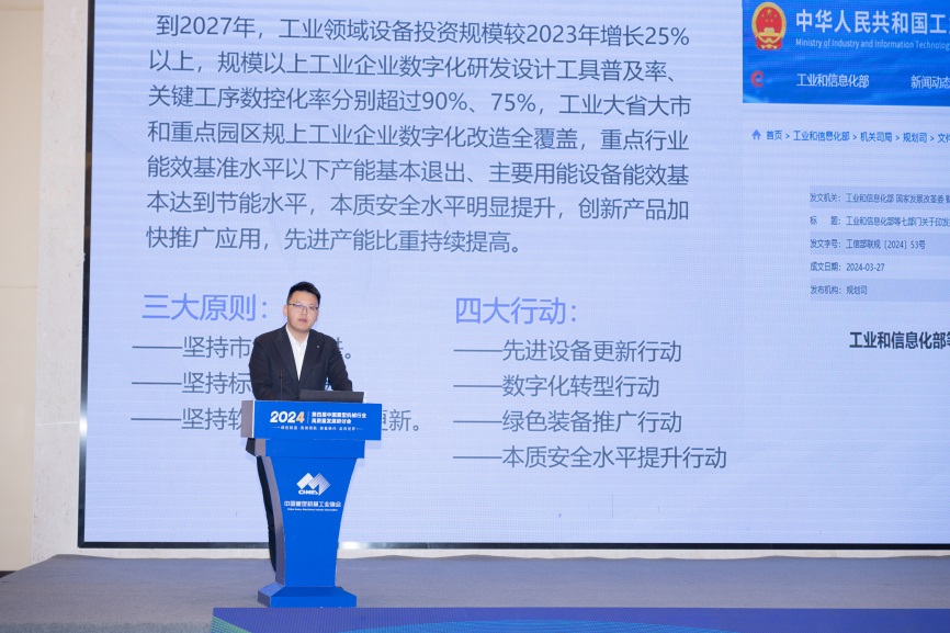 中国电子信息产业发展研究院规划研究所工业投资研究室主任樊蒙做了《推动工业领域设备更新,提升先进产能比重》的报告,从深刻认识推动工业领域设备更新的重要意义、准确把握工业领域大规模设备更新的重点方向、精准使用工业领域大规模设备更新的政策工具三方面对《推动工业领域设备更新实施方案》进行了解读。