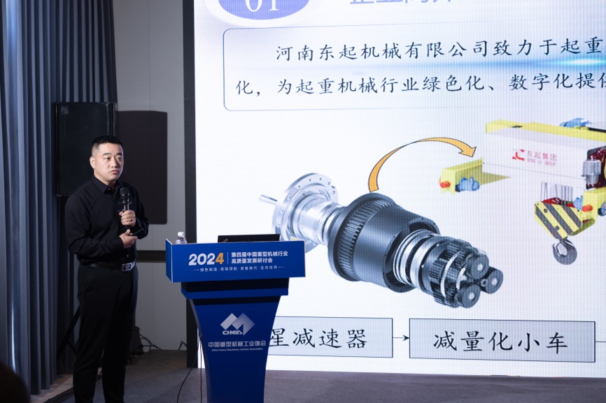 河南东起机械有限公司总经理刘文明做了《“双碳”背景下起重机械驱-控-传-运创新方案开辟新质生产新赛道》的报告,报告从起重机驱控一体化、传动技术集成化、运维数字化、发展绿色化介绍了东起集团创新发展成果。