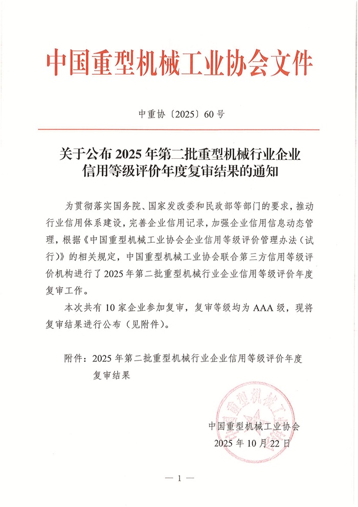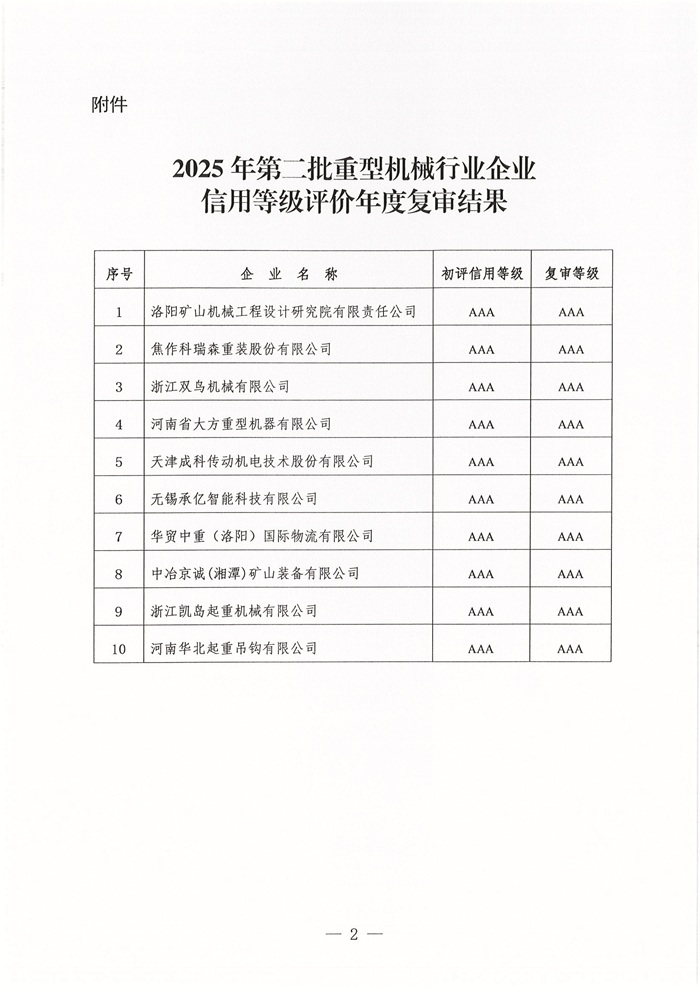 关于公布2025年第二批重型机械行业企业信用等级评价年度复审结果的通知